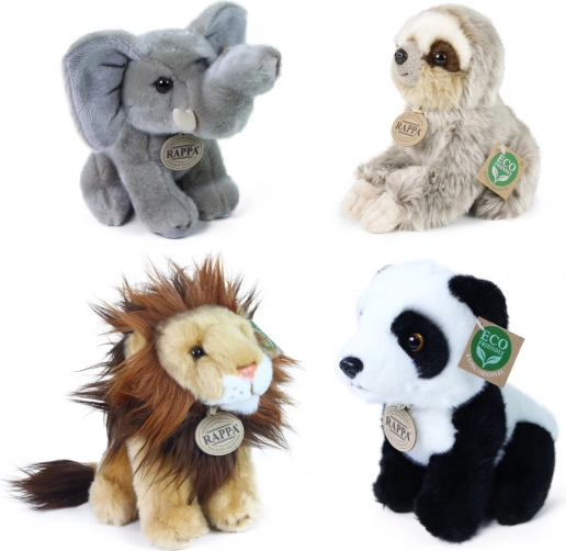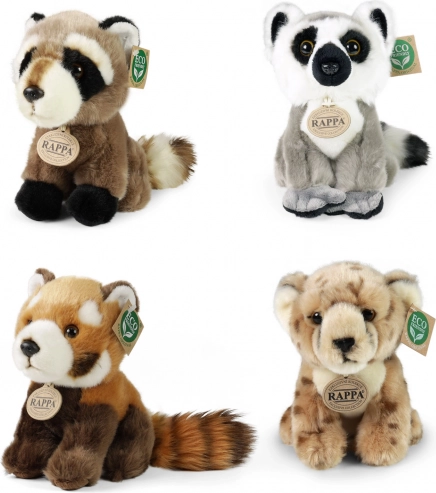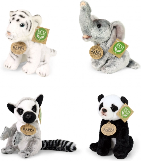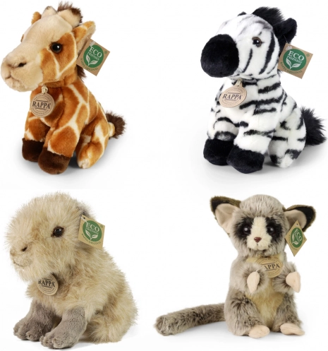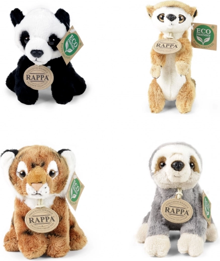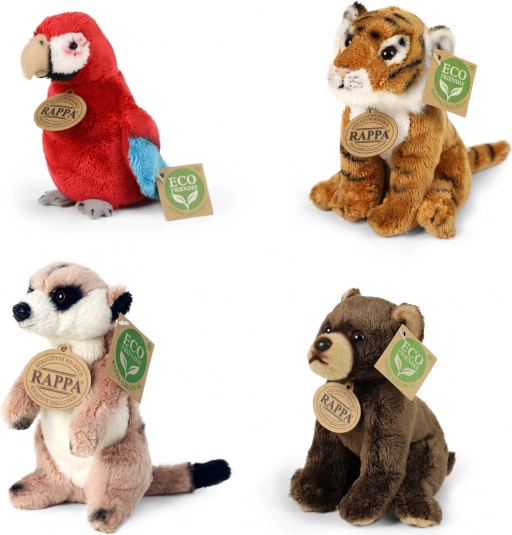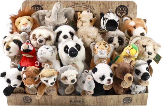 Kompletter Verkaufsdisplay mit einer Auswahl an Plüsch‑Exotiktieren der Marke RAPPA. Jeder Plüsch ist mit Faser aus recycelten PET‑Flaschen gefüllt, sodass er nicht nur weich und kuschelig, sondern auch umweltschonend ist. Der Display aus robustem, laminiertem Karton ist ideal für Geschäfte und Geschenkbereiche und zieht dank realistischer Ausführung und Eco‑Kennzeichnung die Blicke auf sich.