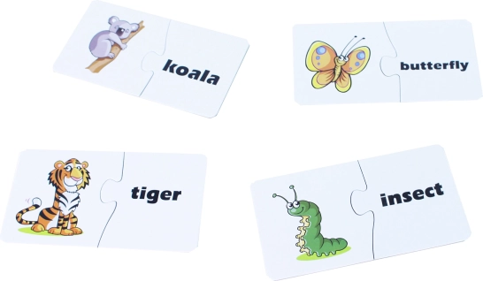 Jedes Teil enthält bunte Illustrationen und Namen wie 'Katze', 'Fisch' und 'Affe', die beim Lernen helfen.