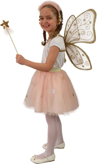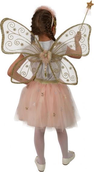 Das Kostüm umfasst goldverzierte Flügel und einen Sternen-Rock, die jedem Mädchen einen zauberhaften Look verleihen.