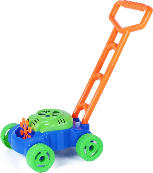 Leichte Bauweise und langer Griff ermöglichen es Kindern, den Rasenmäher leicht zu manövrieren und in Bewegung zu halten, während die Blasen fliegen.