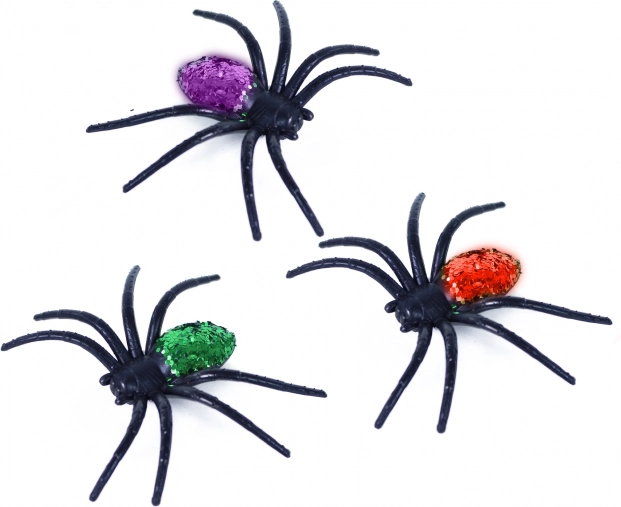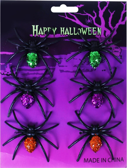 Kleine Gummispinnen, die eine tolle Dekoration für eine Halloween-Party sind! Die Packung enthält 6 bunte, glitzernde Spinnen.