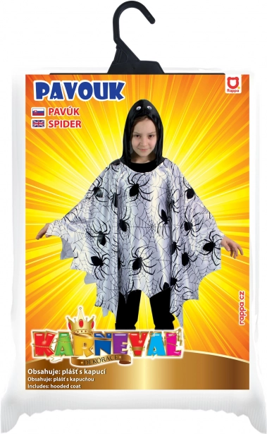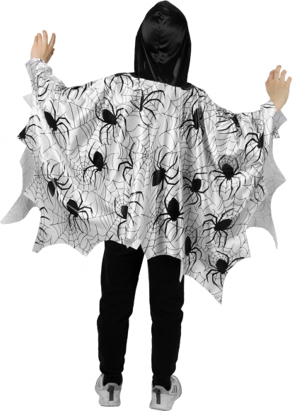 Suchen Sie ein einfaches und effektvolles Kostüm für Kinder? Dieser leichte Umhang/Poncho mit schwarzem Druck von Spinnen und Spinnennetzen auf weißem Grund fällt sofort ins Auge. Dank des lockeren Schnitts lässt er sich bequem über den Kopf anziehen und ermöglicht uneingeschränkte Bewegungsfreiheit beim Spielen, Tanzen und in Umzügen.