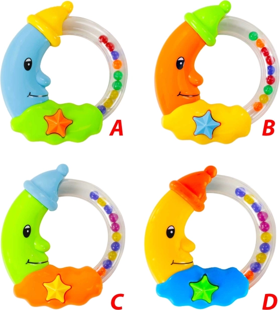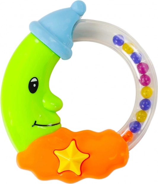 Diese farbenfrohe Rassel in Form eines lächelnden Monds ist das ideale erste Spielzeug für die kleinsten Händchen. Der transparente Ring mit bunten Kügelchen erzeugt beim Bewegen ein angenehmes Geräusch, das die Aufmerksamkeit des Babys weckt und seine natürliche Neugier fördert. Kontrastreiche Farben und ein liebes Design unterhalten und tragen zugleich zur Sinnesentwicklung bei.