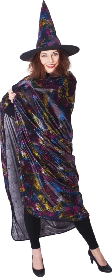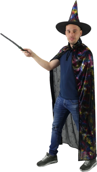 Dieses detailliert gestaltete Kostüm ist ideal für jeden, der magische Abende im dramatischen Stil genießen möchte. Es beinhaltet einen wunderschönen Umhang mit bunten Spinnennetzmustern und einen passenden Hut, der dem gesamten Outfit eine echte magische Atmosphäre verleiht.