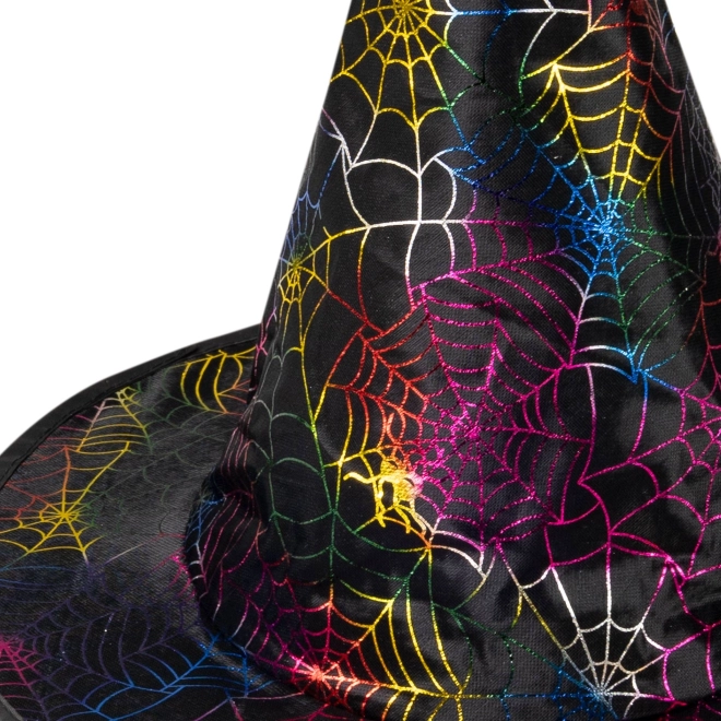 Peppen Sie das Kinder-Hexenkostüm mit diesem stylischen Hut mit buntem Spinnennetz-Motiv auf. Dank der spitzen Form und der breiten Krempe wirkt er authentisch und zugleich verspielt.
