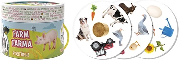 Genießen Sie rasanten Spaß mit dem Thema FARMA! Dieses Aufmerksamkeits-Kartenspiel liefert schnelle Runde um Runde, in denen ein waches Auge und blitzschnelle Reaktionen entscheiden. Dank 30 farbiger Kärtchen und einfacher Regeln sind Sie im Handumdrehen im Spiel.