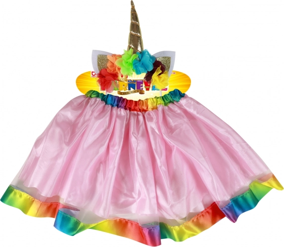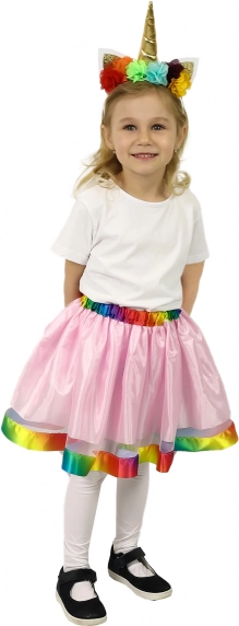Der rosa Rock mit atemberaubendem regenbogenfarbenen Satinsaum ist das zentrale Element des Kostüms, das sofort ins Auge fällt.