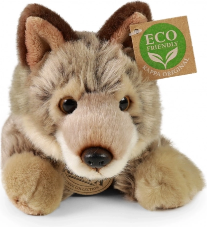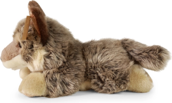 Der kuschelweiche, liegende Wolf wirkt dank detaillierter Merkmale und hochwertigem Material lebensecht. Die Füllung aus recycelten PET‑Flaschen ist haptisch nicht von klassischer Füllung zu unterscheiden, sicher und für die Kleinsten zertifiziert.