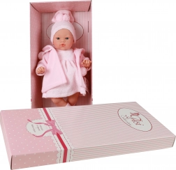 Entdecken Sie die Magie kindlicher Fantasie mit der Puppe ASI Rosa 36 cm – ein zartes Baby mit weichem Stoffkörper sowie Vinylkopf und -gliedmaßen. Die Puppe hat braune Acrylaugen und trägt rosafarbene Strickkleidchen mit warmem Mäntelchen, Mützchen und Socken. Hergestellt in Spanien mit Fokus auf Qualität und Sicherheit (CE).
