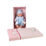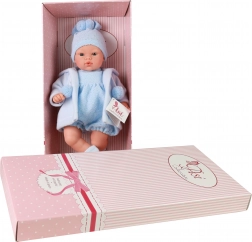 Die Puppe Koke begeistert Kinder und Sammler durch ihr authentisches Aussehen und die sorgfältige Verarbeitung. Der Stoffkörper fühlt sich angenehm an, während die Vinylteile einen realistischen Ausdruck verleihen. Die Puppe hat keine Haare und nicht schließende braune Augen, was ihren Baby-Look unterstreicht. Das Outfit in Blautönen ist in einem sanften, klassischen Stil gehalten.