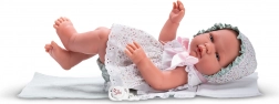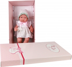 Die Puppe ist hübsch in ein weißes Spitzenkleid mit Mützchen gekleidet und kommt mit einem Kissen, einer Decke und einem Schnuller an einer Kette, der in den Mund eingesetzt werden kann. Geeignet für Rollenspiele, fördert Empathie, Feinmotorik und Fantasie.
