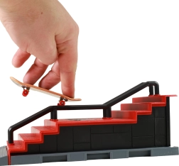 Gestalten Sie Ihr eigenes Fingerboard-Abenteuer mit diesem Mini-Skatepark, der ideal für das Training von Tricks ist. Das Set umfasst eine Rampe mit Treppe und stabilem Geländer, sodass Sie verschiedenste Tricks ausführen können – ganz wie in einem echten Skatepark.