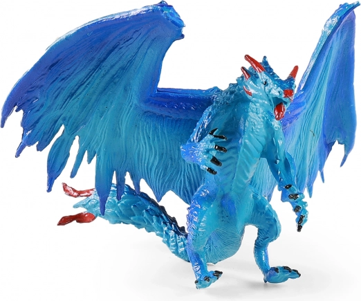 Detailierter blauer Drache mit großen, ausgebreiteten Flügeln und roten Akzenten im Gesicht und am Schwanz.