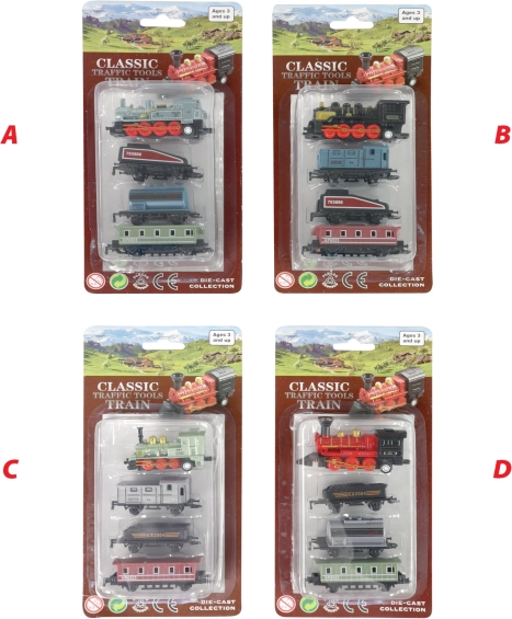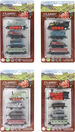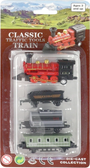 Das Set enthält eine Metalllokomotive und drei Kunststoffwaggons, ideal für kleine Sammler.