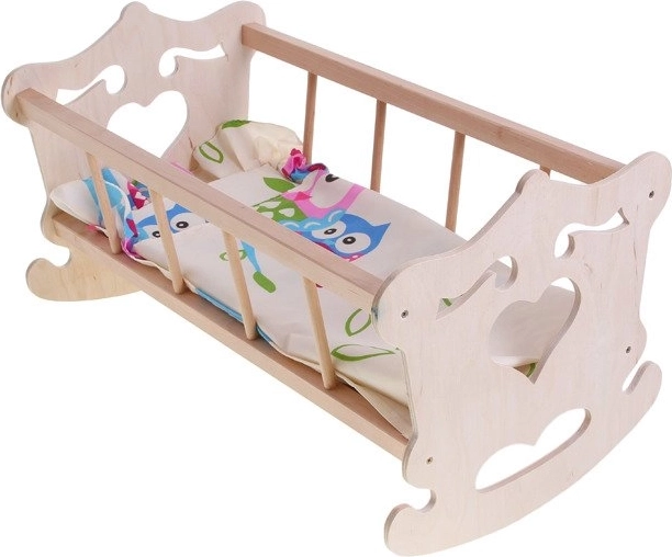 Holz-Wiege für eine Puppe mit einer maximalen Höhe von 50 cm mit bunter Bettwäsche ist ideal für jede kleine Mama.