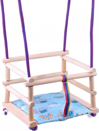 Bunte Holzschaukel zum Aufhängen. Hergestellt aus Buchenholz, lackiert mit umweltfreundlichem Wasserlack. Für Sicherheit sorgt ein Sicherheitsgurt, der das Kind vor dem Herausfallen aus der Schaukel schützt. Die Seile enden mit Kunststoffaufhängern, die eine schnelle Montage oder Demontage der Schaukel von Haken ermöglichen. Zur Schaukel gehört ein weiches Sitzkissen (Polster). Jede Schaukel enthält eine Anleitung für sicheren Gebrauch und Pflege. Die Schaukel bereitet Ihrem Kind viel Freude. Abmessungen der Schaukel: