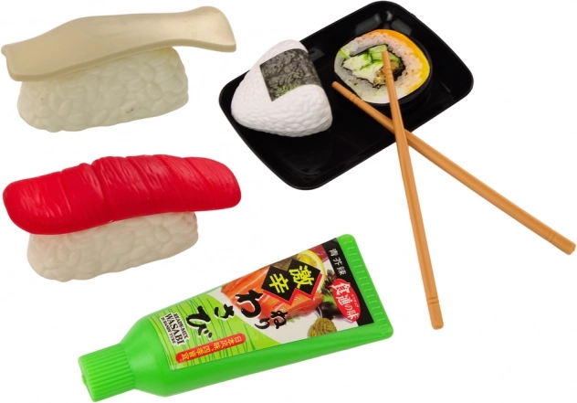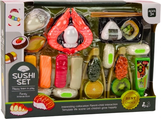 Ein Spielzeugset für Kinder, das die Kleinsten in die magische Welt der Zubereitung und des Servierens von köstlichem Sushi entführt. Das Set enthält verschiedene Zutaten, die zur Zubereitung von leckerem Sushi benötigt werden. Dazu gehören Garnelen, Lachs, Wasabi, Reis, Nori-Algen und Essstäbchen.
