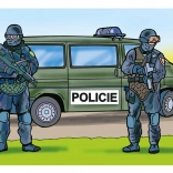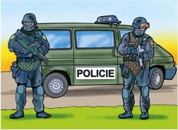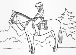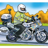 Es stehen acht Vorlagen zum Ausmalen zur Verfügung, darunter Polizeiauto, Motorrad, Boot, Lieferwagen, Hubschrauber, Pferd und Polizisten. Die Gesamtseitenzahl beträgt 16.
