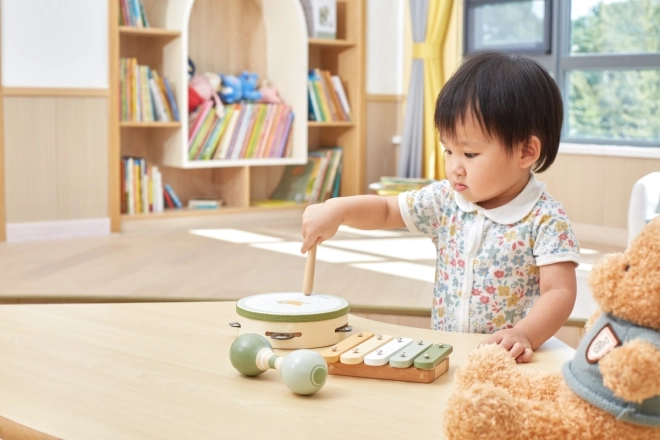Das Set enthält Tamburin, Xylophon und Maracas, die es Kindern ermöglichen, mit verschiedenen Klängen und Rhythmen zu experimentieren.