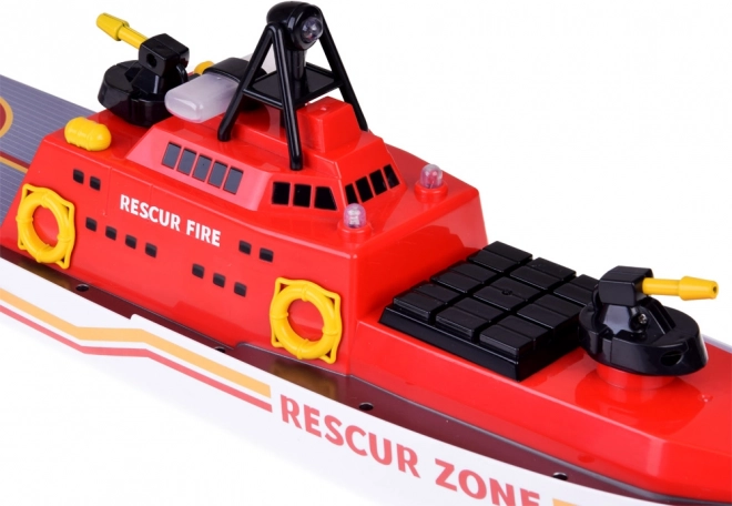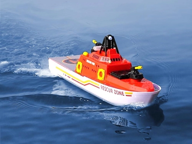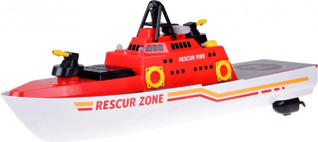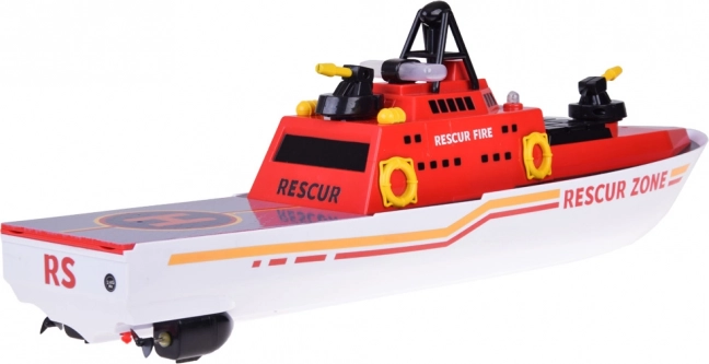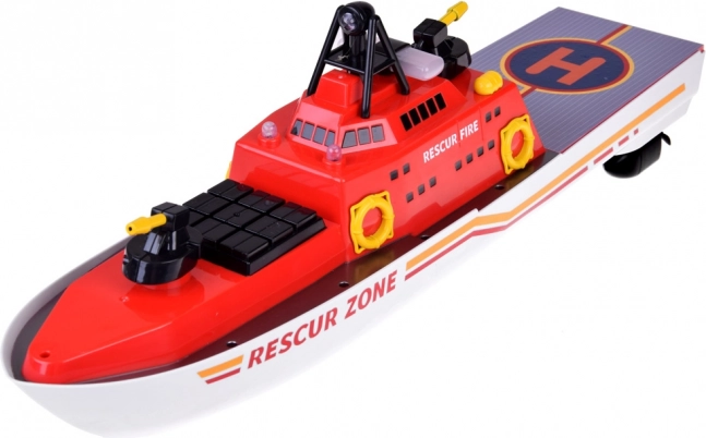 Die Kombination aus roten, weißen und gelben Farben zusammen mit Details wie Wasserkanonen und Antennen tragen zum authentischen Erscheinungsbild des Rettungsbootes bei.