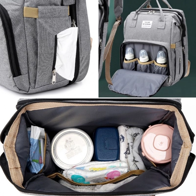 Multifunktionaler Rucksack für die moderne Mutter, der sich an einen hektischen Lebensstil anpasst. Mit einer praktischen Taschenanordnung bietet er Stauraum für mehrere Fläschchen für Essen oder Trinken des Kindes, ein Fach für Feuchttücher, das sich nutzen lässt, ohne die gesamte Packung zu entnehmen, sowie ein Hauptfach zur Aufbewahrung größerer Gegenstände. Dieser Rucksack ist universell einsetzbar und bietet unterwegs eine Ruhegelegenheit für Kleinkinder in einem kleinen Reisebettchen. Dank des multifunktionalen Designs kann der Rucksack auch als Tasche oder als Trolley verwendet werden.