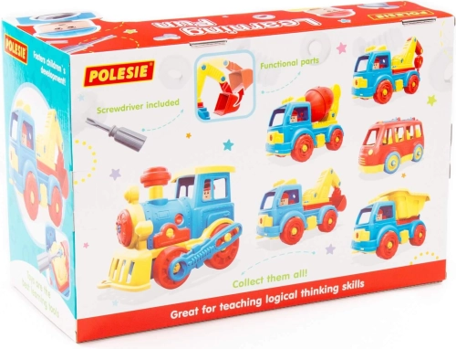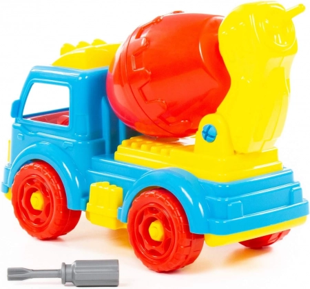 Mit dem beiliegenden Schraubendreher zerlegen und montieren Kinder den Betonmischer immer wieder neu – so trainieren sie Feinmotorik und technisches Denken.