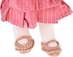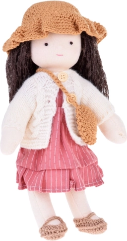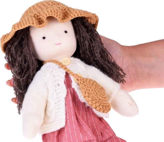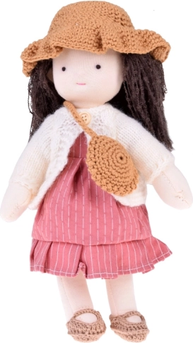 Die Puppe ist in Rosa- und Beigetönen gekleidet: Sie trägt ein gestreiftes Kleid, eine Strickjacke, einen Hut, passende Schühchen und eine kleine Handtasche. Langes, dunkles Haar und sorgfältig gearbeitete Details verleihen der Puppe einen einzigartigen Charme. Die elegante Kartonschachtel macht sie zu einem wunderschönen Geschenk zu Geburtstagen und Weihnachten.