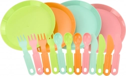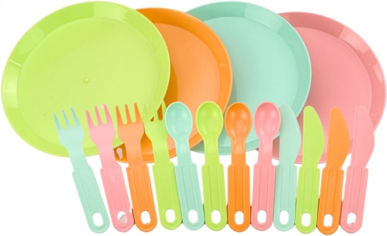 .Das Schneidebrett ist für die Essenszubereitung unverzichtbar und kinderfreundlich. Das Besteckset für 4 Personen enthält Gabeln, Messer und Löffel, sodass Kinder „gemeinsam“ mit Freunden oder der Familie essen können. Vier bunte Teller zum Servieren von Salaten und Obst.