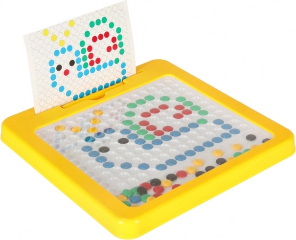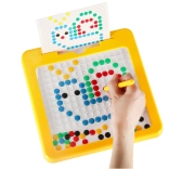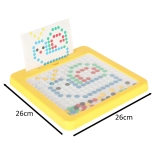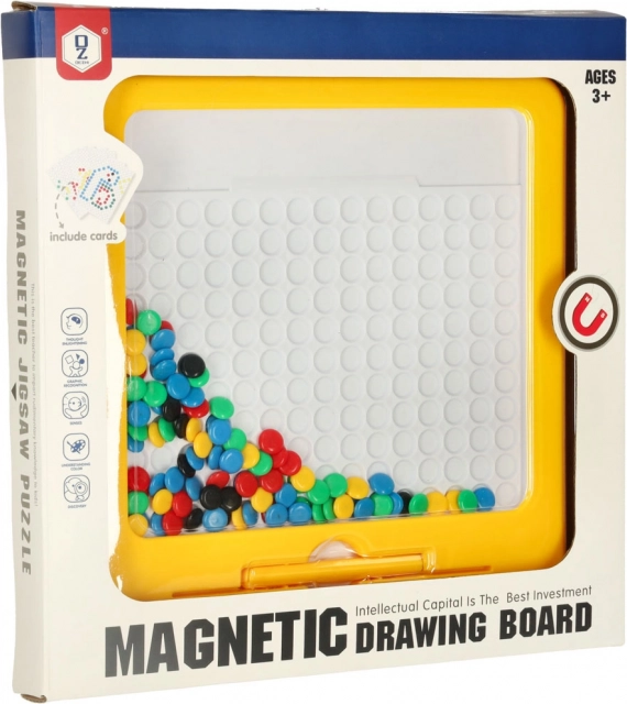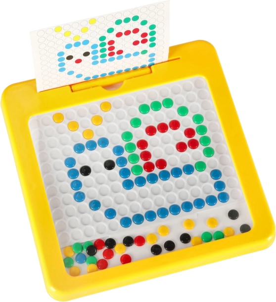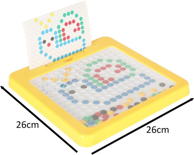 Die magnetische Zeichentafel mit Mosaik ist ein hervorragendes didaktisches Hilfsmittel, inspiriert von Montessori-Prinzipien. Kinder ziehen mit dem Magnetstift farbige „Knöpfe“ in der Platte an und verschieben sie, um einfache oder komplexere Motive zu legen. Die beiliegenden Vorlagenkarten erleichtern den Einstieg und liefern Inspiration.
