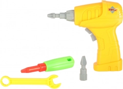 Enthalten sind eine elektrische Bohrmaschine für 2× AA-Batterien, ein Schraubenzieher, ein Schlüssel und Aufsätze – realitätsnaher Heimwerkerspaß, sicher auf Kinder abgestimmt.