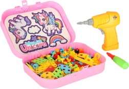 Das Set ist in einem robusten Kunststoffkoffer mit perforierter Platte zum Schrauben untergebracht. Dank der umfangreichen Ausstattung und Aufklebern mit Einhornmotiven macht das Spielen allein oder in der Gruppe besonders viel Spaß.