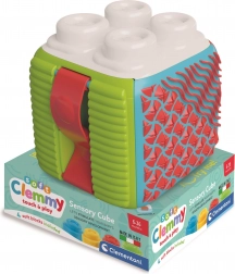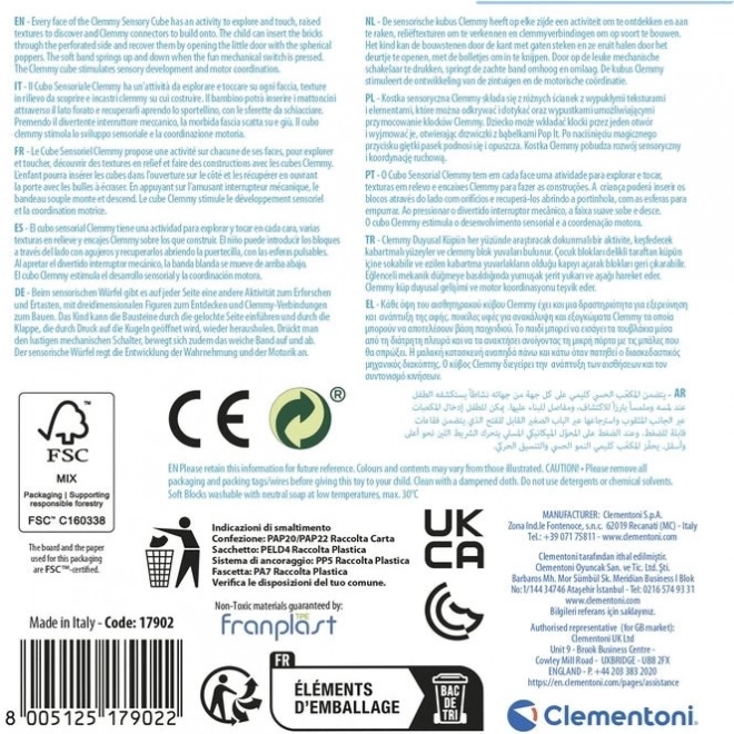 Das Set enthält vier weiche Clemmy-Würfel, die einfach in den Würfel eingesetzt oder aufgestapelt werden können. Der Würfel ist weich, sicher und vollständig abwaschbar, idealerweise bei maximal 30°C mit neutraler Seife.