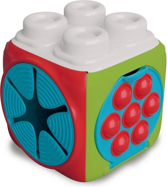 Der Würfel bietet interaktive Elemente wie Klapperspielzeuge für zusätzlichen Spaß.