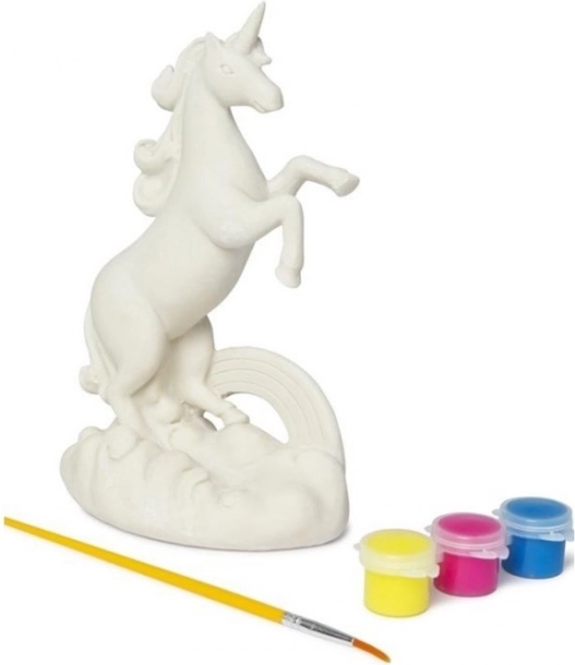 Das Kreativset zur Herstellung einer Gartendekoration in Form eines Einhorns enthält eine Figur, Farben und Pinsel. Einhorn ist so gestaltet, dass es durch seine matte Oberfläche Farben leicht annimmt und ausreichend stabil ist, um Witterungsbedingungen standzuhalten.