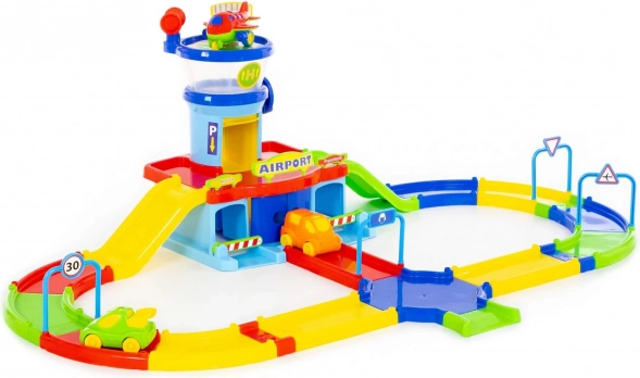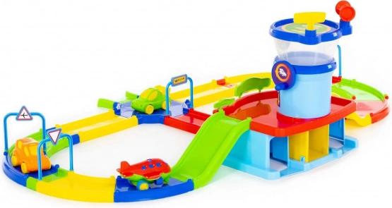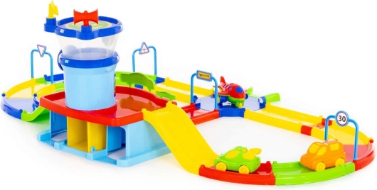 Ein System aus mehrfarbigen Strecken mit Brücken, Tunneln und Anschlüssen für Fahrzeuge und Flugzeuge sorgt für eine reibungslose Fahrt und viele Spielszenarien.