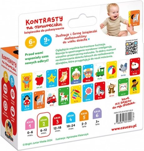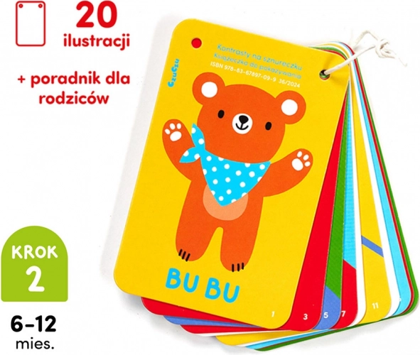Entdecken Sie die Welt mit Ihrem Baby dank des kontrastreichen Büchleins von CzuCzu am Band. Der hohe Kontrast der Illustrationen stimuliert das Sehen, unterstützt die Sprachentwicklung und die Konzentration. Dank praktischer Löcher und der Schnur können Sie es leicht über dem Bettchen befestigen oder auf Reisen mitnehmen.
