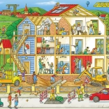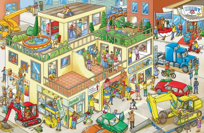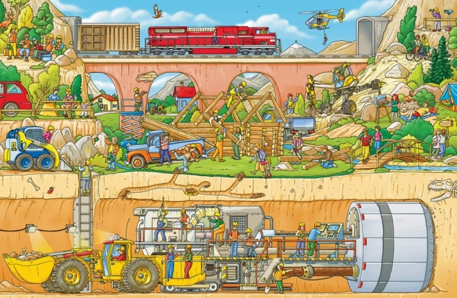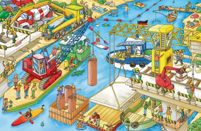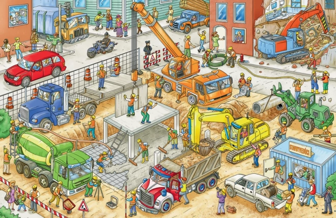 Das Buch enthält stark illustrierte Szenen, die die lebendige Umgebung der Baustelle mit verschiedenen Baumaschinen zeigen.