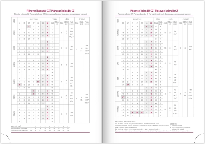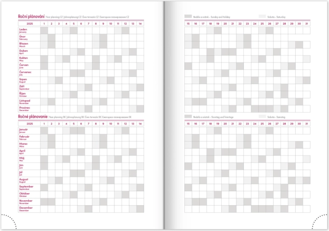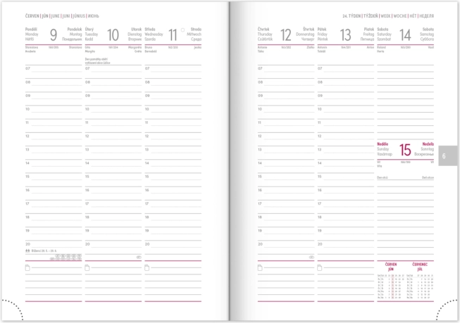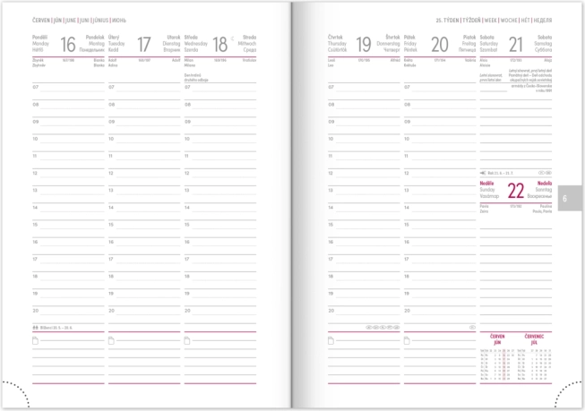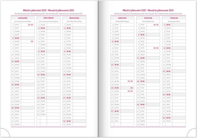 Das praktische Layout mit Wochenübersicht und tschechisch‑slowakischem Kalendarium, ergänzt um Englisch, Deutsch, Ungarisch und Russisch, sorgt für perfekte Übersicht. Monats- und Jahresplaner, Platz für Notizen sowie hilfreiche Karten und ein Namensverzeichnis fehlen ebenfalls nicht.