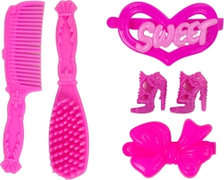 Das Set umfasst einen rosa Kamm, eine Bürste und weitere Stil-Accessoires, die Pflege und Kreativität beim Spielen fördern.