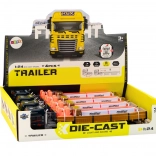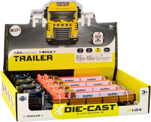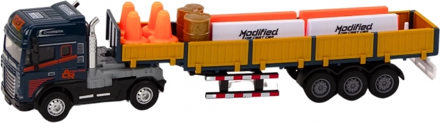 Dieses blaue Lkw-Set mit Anhänger im Maßstab 1:24 bildet einen echten Sattelzug detailgetreu nach. Der Auflieger hat seitliche Türen zum Öffnen für einfachen „Be- und Entlade“-Betrieb, auf der Ladefläche befinden sich zwei Fässer als Fracht. Das Modell ist mit Licht und Geräuschen für Motorstart und Rückwärtsfahren ausgestattet, was die Authentizität des Spiels erhöht.