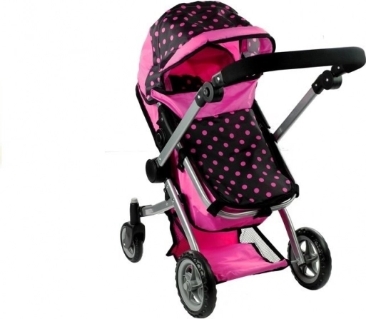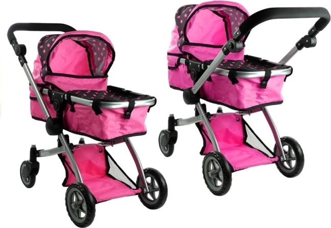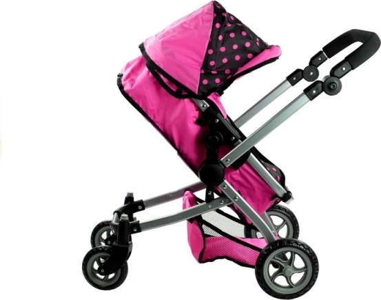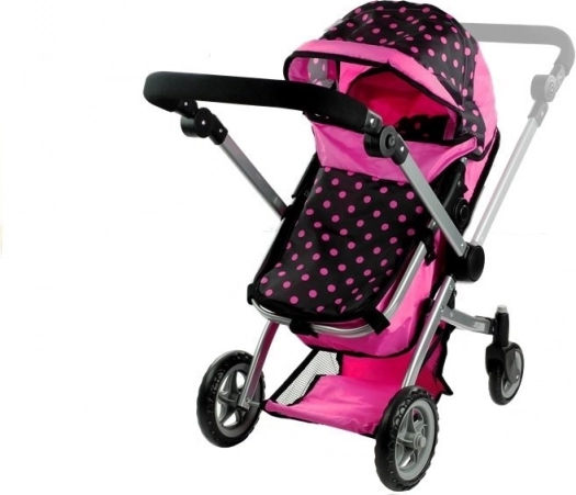 Der Puppenwagen Alice 2-in-1 überzeugt durch realistische Ausführung und vielseitiges Design. Im Handumdrehen verwandeln Sie ihn vom klassischen Wagen mit Wanne in einen Sportwagen. Die Kombination aus Rosa und Schwarz mit Punkten wirkt verspielt und modern, während der robuste Metallrahmen und hochwertige Bezüge für lange Haltbarkeit sorgen.