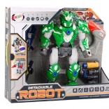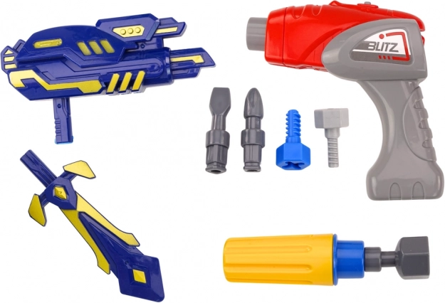 Im Set enthalten sind ein kinderfreundlicher Bohrer und ein Schraubendreher für kleine Hände sowie drei wechselbare Aufsätze. Nach dem Zusammenbau kann das Batteriemodul aus dem Bohrer als Antrieb genutzt werden und der Roboter fährt vorwärts oder rückwärts. Das Spiel wird durch Licht- und Soundeffekte sowie thematische Accessoires – ein Schwert und eine dunkelblaue Waffe – für spannende Missionen und Geschichten noch intensiver.
