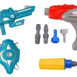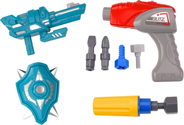 Das Set enthält sicheres Kinderwerkzeug – Bohrmaschine und Schraubendreher – mit austauschbaren Aufsätzen für vielfältige Aufgaben. Dank Licht- und Soundeffekten ist das Spiel noch fesselnder. Der Roboter verfügt außerdem über einen türkisfarbenen Schild und eine Waffe, sodass Kinder eigene Missionen und Geschichten erfinden und ihre Fantasie entwickeln können.