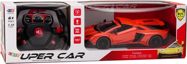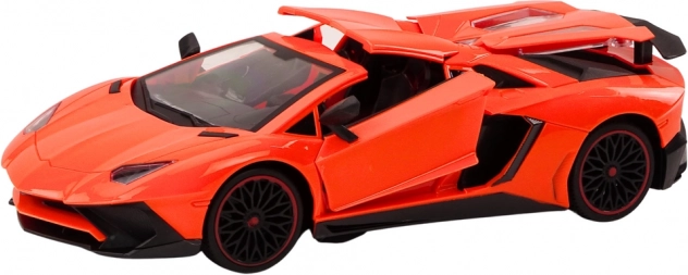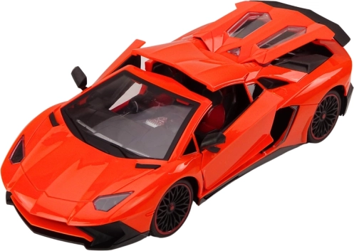 Orange Karosserie mit schwarzen Details schafft das authentische Aussehen eines Sportwagens. Alle Türen sind öffnend und tragen zur Realität bei.