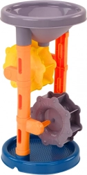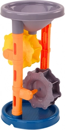 Das Sandspielzeug-Set mit Mühle ist die ideale Ausrüstung für jeden kleinen Strandfan oder Liebhaber von Sandspielen. Im Mittelpunkt steht eine Mühle mit zwei Rädern, die eine doppelte Funktion hat: Auf der einen Seite befindet sich ein Sieb zum Aussieben des Sands, auf der anderen Seite ein Trichter.