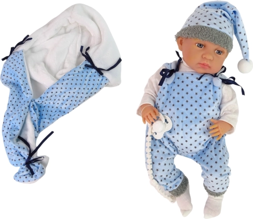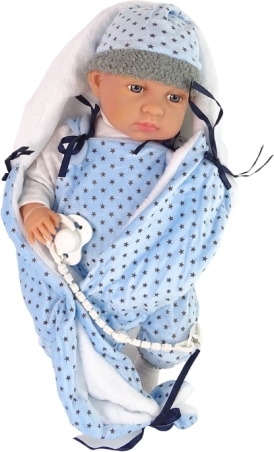 Diese 46 cm große Puppe hat ein realistisches Aussehen, mit beweglichen Armen, Beinen und Kopf, was zu einem wirklich authentischen Spielerlebnis beiträgt. Weiche und angenehme Materialien sorgen dafür, dass die Puppe angenehm zu berühren ist. Das Kind kann mit dem Wechseln der Kleidung spielen, da die Puppe leicht austauschbare Kleidung hat. Das Outfit beinhaltet einen blau-schwarzen Schlafanzug und eine Decke im Sternen-Stil.