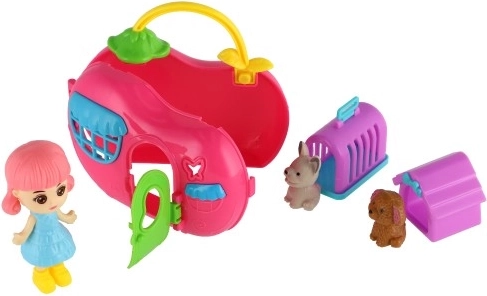 Eine niedliche Puppe, ein Hündchen und ein Häschen, ergänzt um Häuschen und Transportbox, bieten Kindern vielfältige Szenarien und fördern ihre Vorstellungskraft und Feinmotorik.