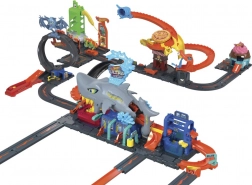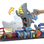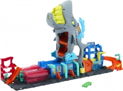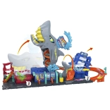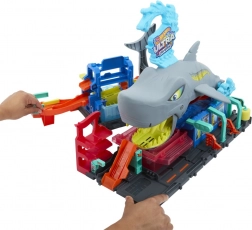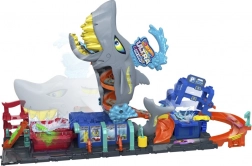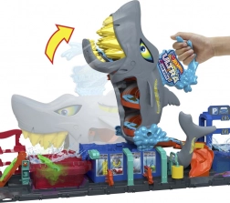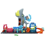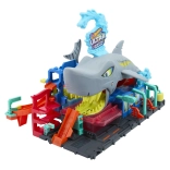 Entdecken Sie spannende Abenteuer mit der Hot Wheels City Waschstraße, in der ein dominanter Hai Ihre Kinder ins Geschehen zieht. Fahren Sie mit dem beiliegenden Color-Reveal-Fahrzeug die Rampe hinauf direkt in das offene Maul des Hais! Durch Drücken des Haikopfes ändern Sie die Wassertemperatur und beobachten, wie neue Dekore auf Ihrem Fahrzeug sichtbar werden.