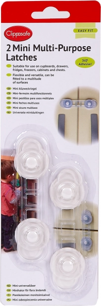 Mehrzweck-Kindersicherung von Clippasafe schützt vor neugierigen Kinderhänden. Einfach anzubringen und kompatibel mit verschiedenen Materialien und unregelmäßigen Oberflächen.