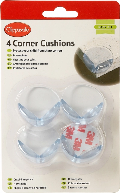 Transparente Eckenschützer aus weichem Kunststoff von Clippasafe bieten maximalen Schutz für kleine Kinder. Perfekt für Glastische, Regale und andere Möbel. Set mit 4 Stück, leicht zu montieren.